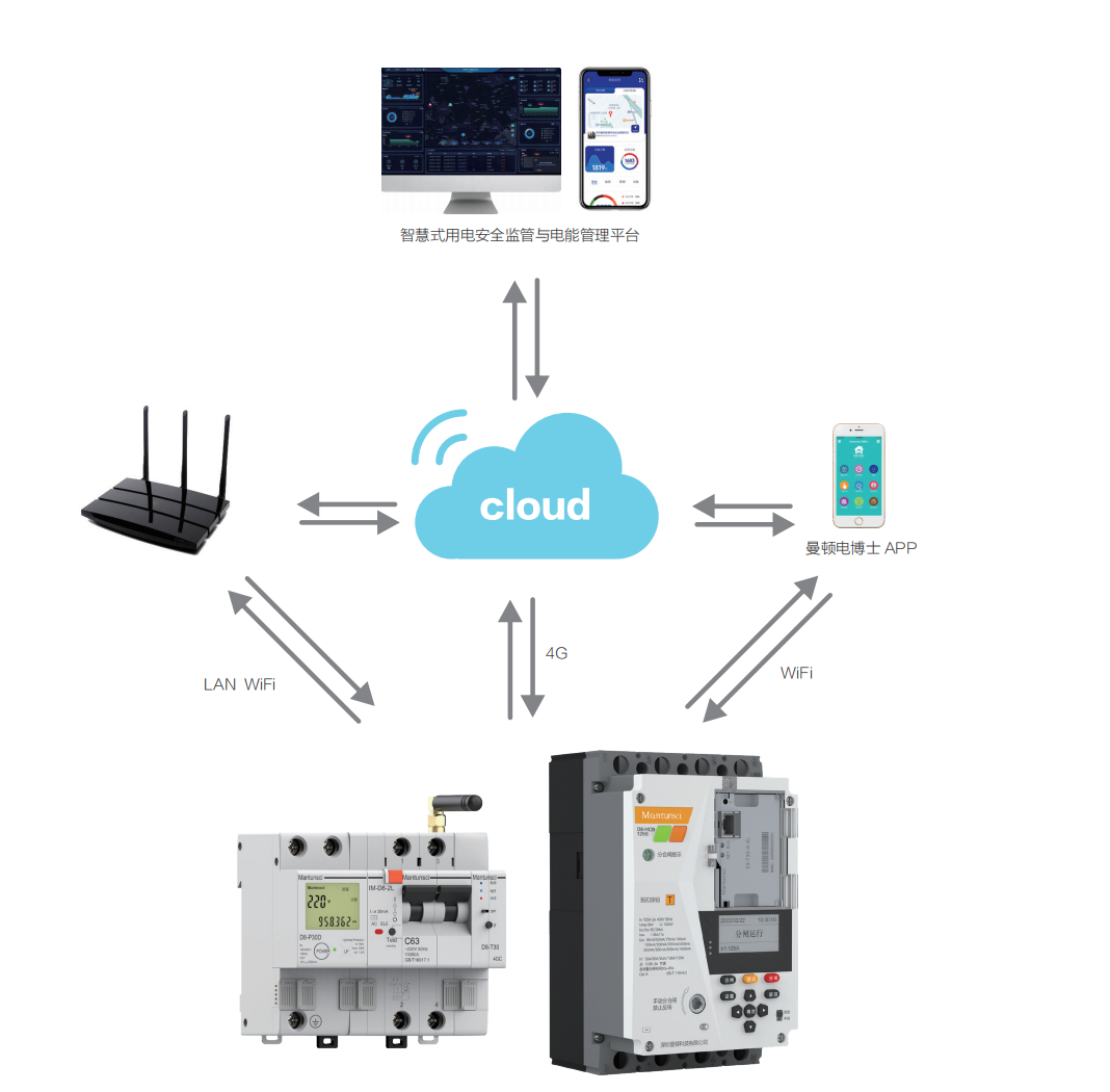 智慧式用电安全监管与电能管理平台,创新运用物 联网、大数据、云计算技术,可实现远程控制、实时监 控、线路故障预警、线路故障报警、能耗监测,借助大 数据挖掘和分析,可以实现用电行为分析、设备健康管 理、节能降耗管理等。 曼顿云平台可提供多站点的访问,同时监测和比较不同 设施的性能。根据用户级别提供个性化的用户管理配置, 包括智能手机与电力安全监督和电源管理软件平台等不 同终端的应用程序操作版本。