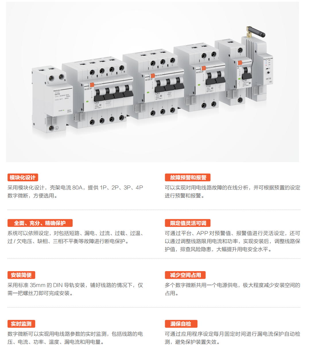 智能微断是一款将传统机械保护与前沿数字智能技术深度融合的新型智能断路器。它不仅提供机械短路和过载的基础安全 保障,更集成了远程控制、分相反时限过流、精确功率过载保护,以及针对三相系统的缺相、不平衡、相序保护。同时,它具备 过压欠压、端子 / 内部温度等全方位的实时预警和报警功能,确保电力系统运行在最高安全标准。