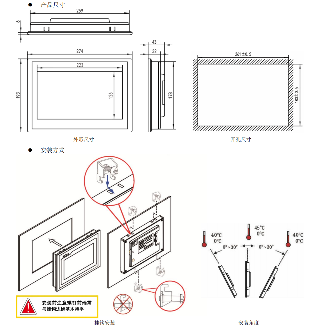 一、产品介绍 N 系列物联网屏通过本地/4G/WiFi 联网,可对屏和屏所连接的设备进行远程运维操作。远程数据终端,可接收 4G/NB 无线温度进行显示并转换为 MODBUS RTU TCP 数据传送给 PLC 或上位机。可对接目前行业内大部分通用设备,如温度、压力、环境、电表多种传感器,通过控制显示屏进行数据汇总,适合小场景智能控制。节省成本。二、技术参数二、安装示意
